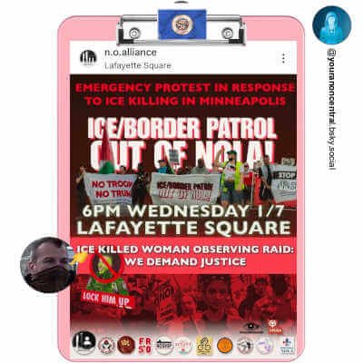 - bsky .app/profile/youranoncentral.bsky.social/post/3mbug55fjpc2l (‘ 🚨Call to Action🚨: Emergency rally in response to the ICE murder in Minneapolis, Jan 7, 6PM, Lafayette Square, D.C. #3E #EndImpunity ‘)