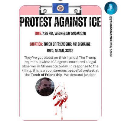 - bsky .app/profile/youranoncentral.bsky.social/post/3mbuge2qiy22l (‘ 🚨Call to Action🚨: Emergency rally in response to the ICE murder in Minneapolis, Jan 7, 7:30PM, Torch of Friendship, Miami. #3E #EndImpunity ‘)