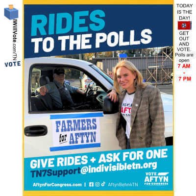 • facebook .com/photo?fbid=738262405968553 (‘ Donna Stern : Indivisible TN7 District is stepping up to help get people to the polls. If you need a ride email Tn7Support@indivisibletn.org.; 2-‪Today is the day!!! Vote Aftyn for Congress!!! We can do this y’all!!! There is hope for Tennessee!!! Let’s make it happen! Dec. 1, 2025 ‘)