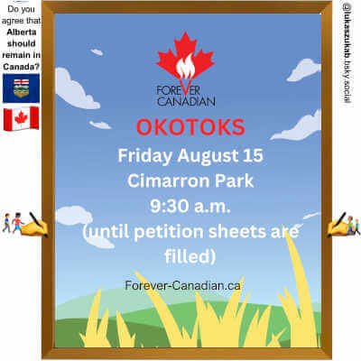 • facebook .com/photo.php?fbid=1210679924410826 (‘ 1-OKOTOKS Friday August 15 Cimarron Park 9:30a.m. (until petition sheets are filled); 2-Many of you have messaged us from #okotoks and we now have a volunteer signature collector ready to meet you. Take photos and tag us share your story and why you are involved in the #forevercanadian campaign. 🇨🇦 ‘)