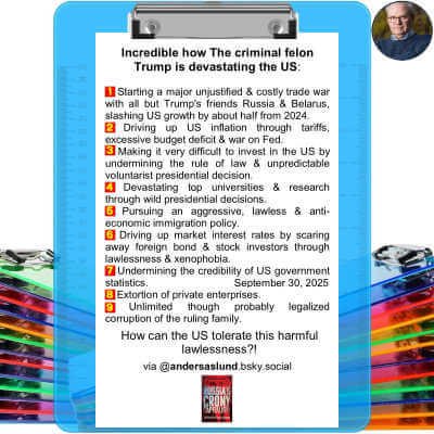 • bsky .app/profile/andersaslund.bsky.social/post/3m23ldcgc5s2q (‘ 👂Incredible how The criminal felon Trump‬ is devastating the US: 1. Starting a major unjustified & costly trade war with all but Trump’s friends Russia & Belarus, slashing US growth by about half from 2024. 2. Driving up US inflation through tariffs, excessive budget deficit & war on Fed. 2-3. Making it very difficult to invest in the US by undermining the rule of law & unpredictable voluntarist presidential decision. 4. Devastating top universities & research through wild presidential decisions. 5. Pursuing an aggressive, lawless & anti-economic immigration policy. 6. Driving up market interest rates by scaring away foreign bond & stock investors through lawlessness & xenophobia 7. Undermining the credibility of US government statistics. 8. Extortion of private enterprises. 9. Unlimited though probably legalized corruption of the ruling family. How can the US tolerate this harmful lawlessness?! ‘)