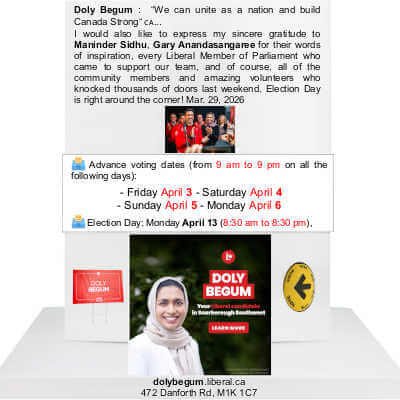 !–📹Doly Begum, “We can unite as a nation and build Canada Strong“ 🇨🇦… I would also like to express my sincere gratitude to 📹Maninder Sidhu, 📹Gary Anandasangaree for their words of inspiration, every Liberal Member of Parliament who came to support our team, and of course, all of the community members and amazing volunteers who knocked thousands of doors last weekend. Election Day is right around the corner! 🗳️ Advance voting dates (from 9 am to 9 pm on all the following days): – Friday April 3 – Saturday April 4 – Sunday April 5 – Monday April 6 🗳️ Election Day: Monday April 13 (8:30 am to 8:30 pm), Mar. 29, 2026