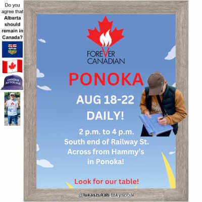 • bsky .app/profile/lukaszukab.bsky.social/post/3lwnmujtick2i (‘ STONY PLAIN; Ponoka, August 18-22, Daily! From 2 p.m. to 4 p.m., south end of Railway St. across from Hammy’s in Ponoka!; Airdrie, Monday/Tuesday, August 18/19 Airdrie Public Library, 304 Main Street S, here are your upcoming #ForeverCanadian petition signing locations… ‘)