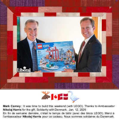 • bsky .app/profile/mark-carney.bsky.social/post/3mcbjr2gxgs2i (‘ It was time to build this weekend (with LEGO). Thanks to Ambassador Harris for the gift. Solidarity with Denmark. 🇨🇦🇩🇰. “En fin de semaine dernière, c’était le temps de bâtir (avec des blocs LEGO). Merci à l’ambassadeur Harris pour ce cadeau. Nous sommes solidaires du Danemark. 🇨🇦🇩🇰” ‘)