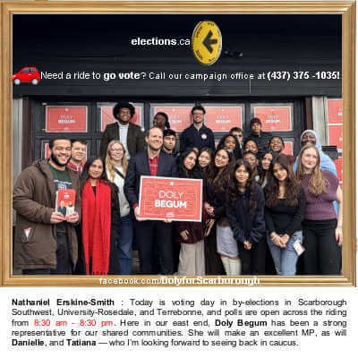 facebook .com/photo/?fbid=1327904969157539 (‘ Nathaniel Erskine-Smith is with 📹Doly Begum: Today is voting day in by-elections in Scarborough Southwest, University-Rosedale, and Terrebonne, and polls are open across the riding from 8:30 am – 8:30 pm. Here in our east end, Doly Begum has been a srong representative for our shared communities. She will make an excellent MP, as will 📹Danielle, and 📹Tatiana — who I’m looking forward to seeing back in caucus. Apr 13, 2026 ‘)
