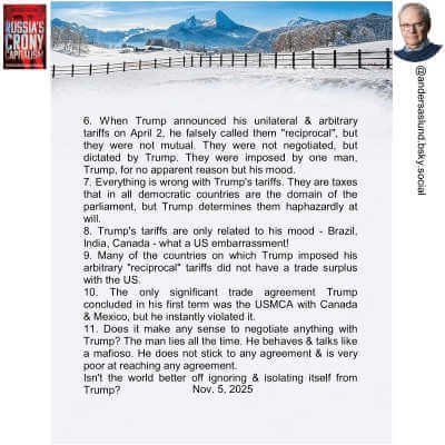 bsky .app/profile/andersaslund.bsky.social/post/3m4w5iicflc25 (‘ 📜Anders Åslund : …6. When Trump announced his unilateral & arbitrary tariffs on April 2, he falsely called them “reciprocal”, but they were not mutual. They were not negotiated, but dictated by Trump. They were imposed by one man, Trump, for no apparent reason but his mood. 7. Everything is wrong with Trump’s tariffs. They are taxes that in all democratic countries are the domain of the parliament, but Trump determines them haphazardly at will. 8. Trump’s tariffs are only related to his mood – Brazil, India, Canada – what a US embarrassment! …11. Does it make any sense to negotiate anything with Trump? The man lies all the time. He behaves & talks like a mafioso. He does not stick to any agreement & is very poor at reaching any agreement. Isn’t the world better off ignoring & isolating itself from Trump? ‘)